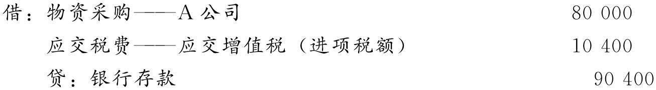 【例4-9】顺达商贸有限公司是一家生活用品的批发企业,日前从A公司购进运动服500套,每套单价160元,货款合计80 000元,增值税额10 400元。