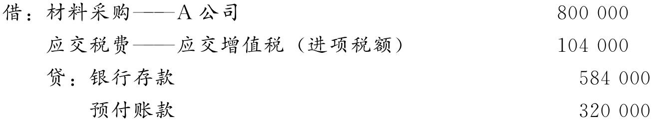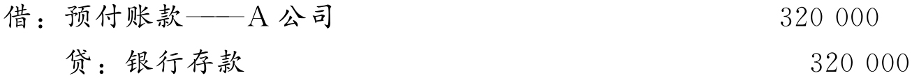(1)7月1日,签发转账支票320 000元,预付A公司100吨铝合金板材40%的货款,编制会计分录如下: