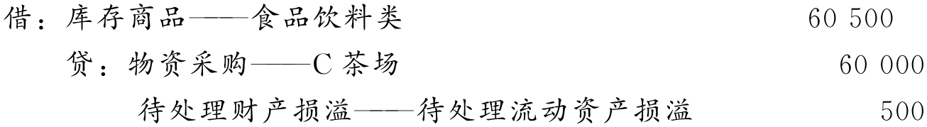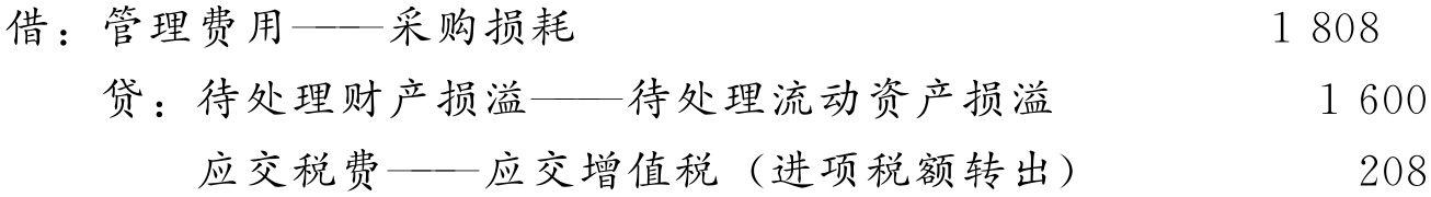 (3)因为这批茶叶全部为密封包装,丢失的20公斤茶叶全部属于非正常损耗,作为本单位的管理费用处理。编制会计分录如下: