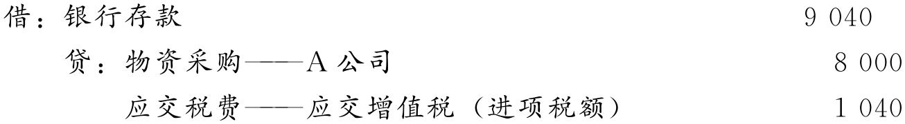 收到厂方的销货折让发票,并收到对方退回的折让款8 000元及增值税额1 040元,存入银行,编制分录如下: