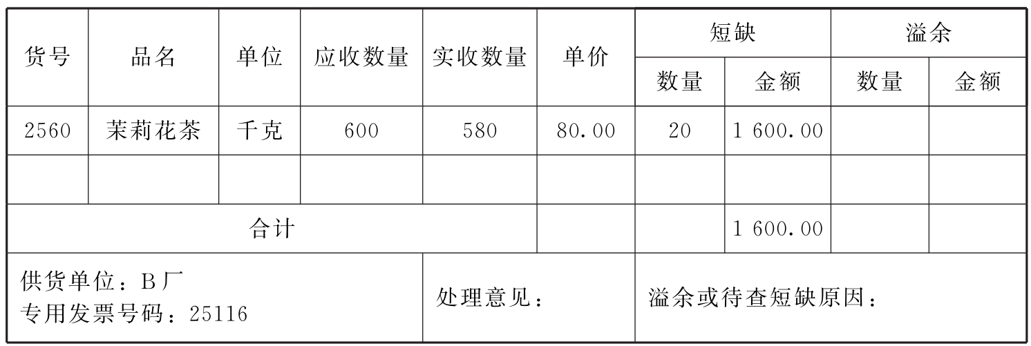 (2)商品到达后,储运部门验收时,实收580千克,发现丢失了一箱,短缺20千克,计货款1 600元,填制“商品购进短缺溢余报告单”如表4-2所示。