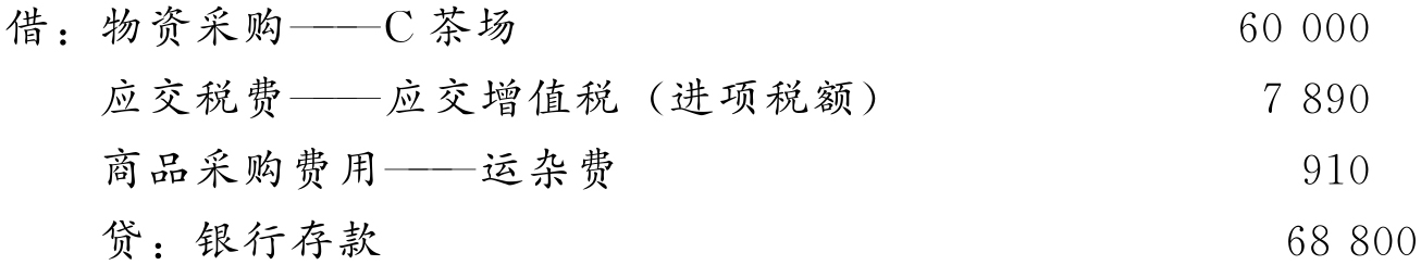 【例4-5】贸兴商贸有限公司向C茶场购进袋装茉莉花茶1 200千克,每千克50元,共计货款60 000元,增值税额7 800元,运费1 000元,采用托收承付结算方式。