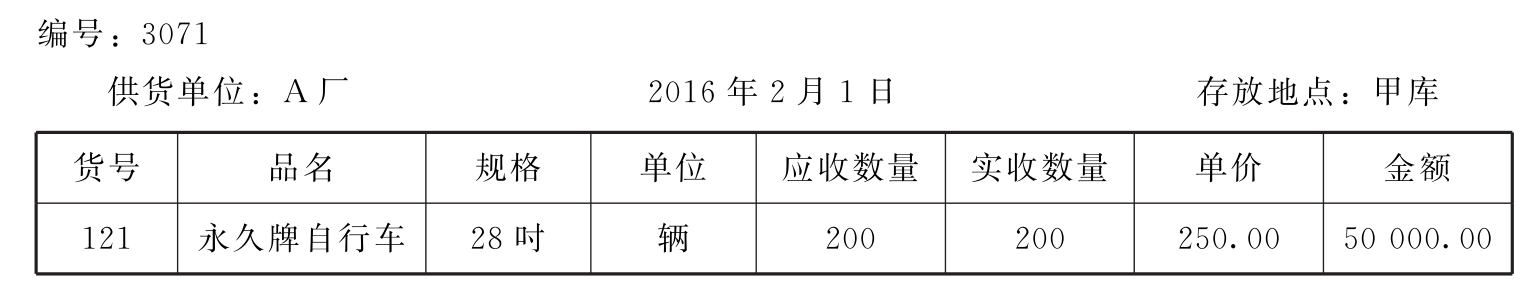【例4-1】2016年2月1日,北京交电批发公司向A厂购进28吋永久牌自行车200辆,每辆250元,计货款50 000元,增值税额6 500元,业务部门根据供货单位的专用发票填制收货单如表4-1所示。