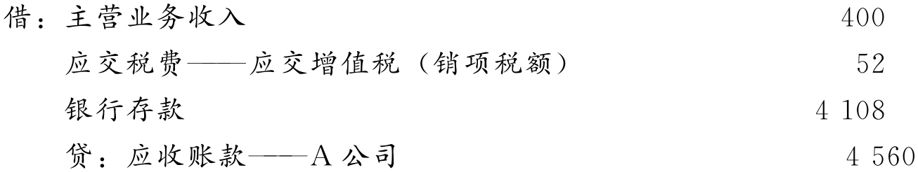 如查明该50箱花瓶是质量不好,经协商后决定给予10%的销货折让,业务部门转来专用发票,退还其货款400元、增值税额52元。今收到对方汇来的货款、增值税额及该部分商品的运费计4 108元,编制分录如下: