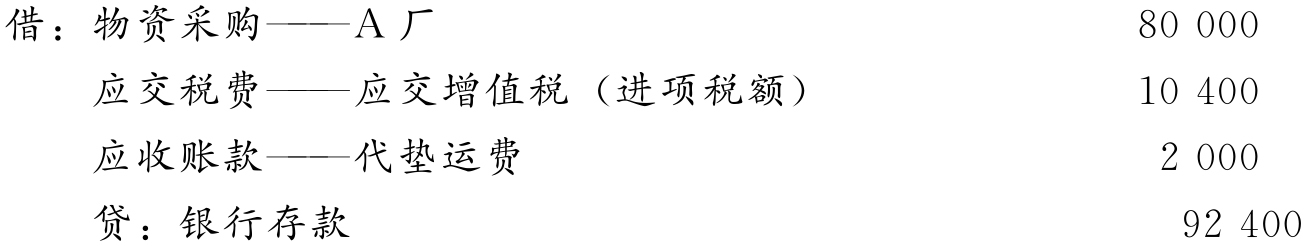 (1)根据银行转来A厂的家用电风扇货款80 000元,增值税额10 400元,运费凭证2 000元,经审核无误,当即承付,编制分录如下: