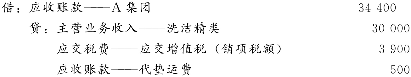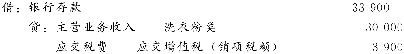 【例4-12】顺达商贸有限公司销售白猫洗衣粉500箱,每箱60元,计货款30 000元,增值税额3 900元,价税合计33 900元。