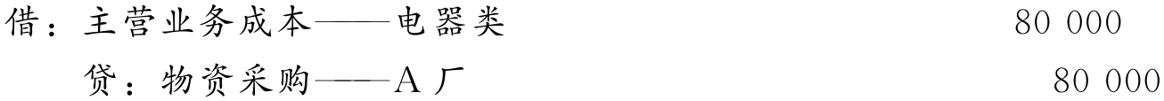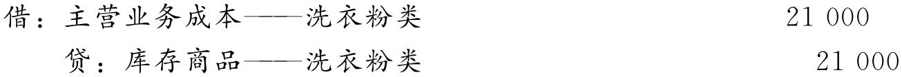 (2)该品牌洗衣粉每箱进价成本为35元,共计金额21 000元,予以结转,编制分录如下:
