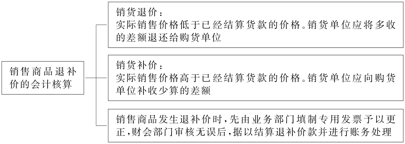 以上是销货退价的会计核算,若发生销货补价时,则借记“银行存款”账户或“应收账款”账户;贷记“主营业务收入”账户和“应交税费”账户。