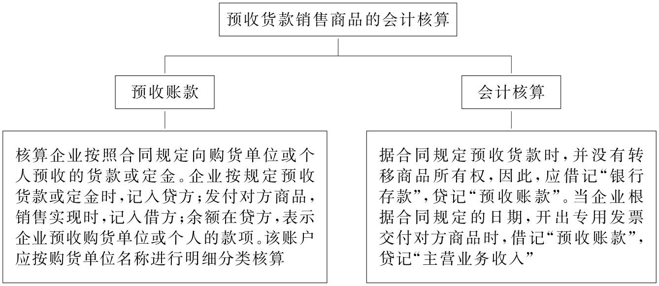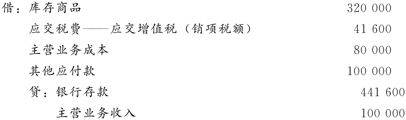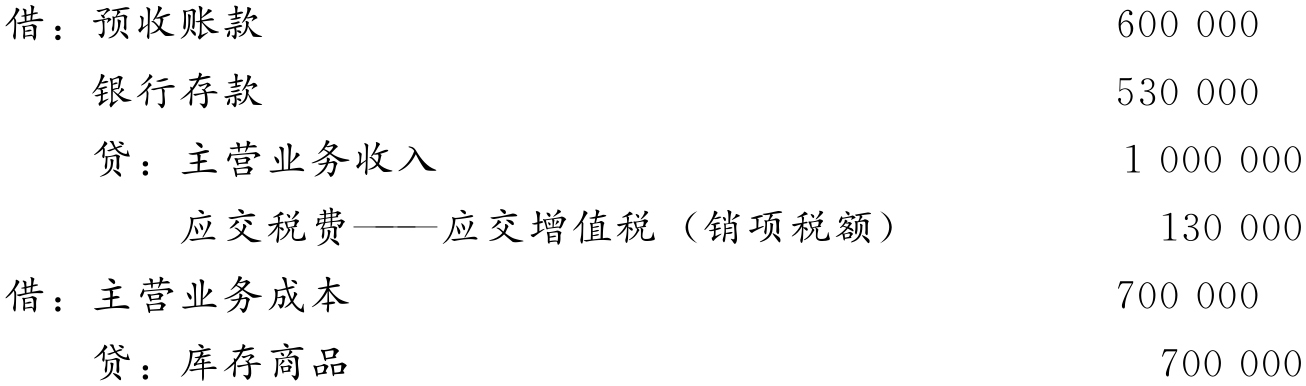 【例4-15】立兴商业公司与A公司签订协议,采用预收款方式向A公司销售一批商品。该批商品实际成本为700 000元。协议约定,该批商品销售价格为1 000 000元,增值税额为130 000元;A公司应在协议签订时预付60%的货款(按销售价格计算),剩余货款在两个月后支付。立兴商业公司的账务处理如下: