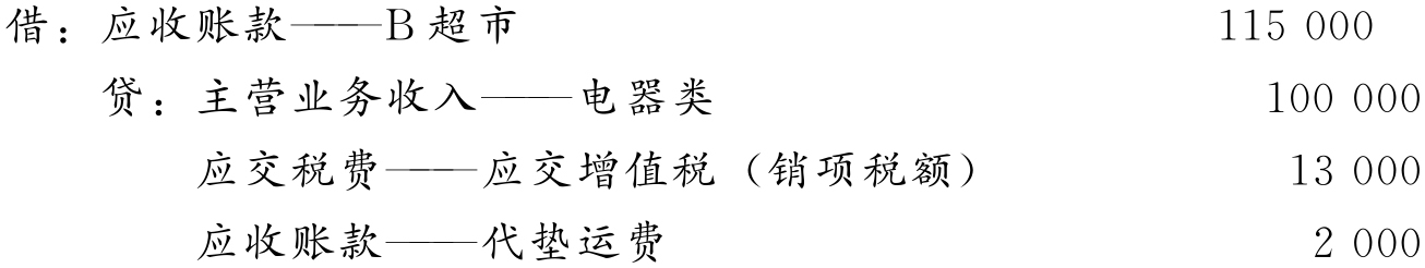 (2)向B超市销售家用电风扇500台,每台200元,货款100 000元,增值税额13 000元,连同代垫运费2 000元,一并向B超市托收,根据专用发票(记账联)及托收凭证(回单联),编制分录如下: