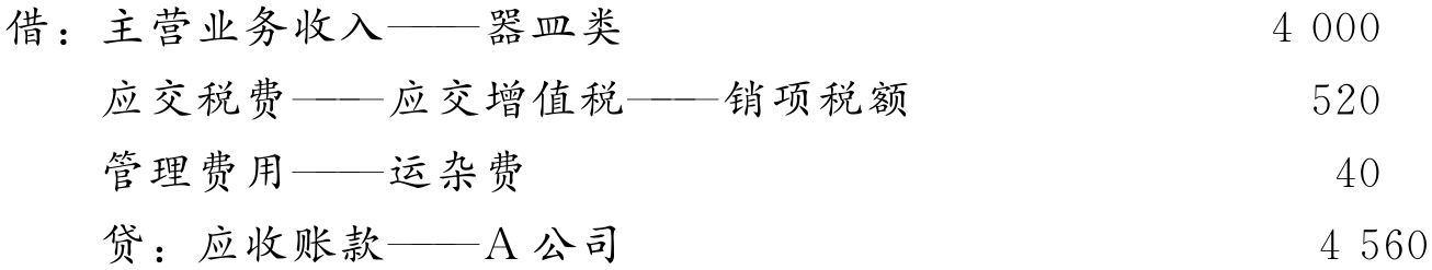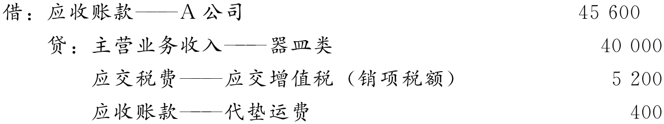 【例4-24】顺达商贸有限公司销售给A公司玻璃花瓶500箱,每箱80元,共计货款40 000元,增值税额5 200元,代垫运费400元,日前已支付。