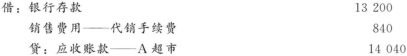 (3)4月30日,A超市扣除了代销手续费840元后,付来了已售代销的600只铸铁炒锅的货款及增值税额13 200元,存入银行,编制分录如下: