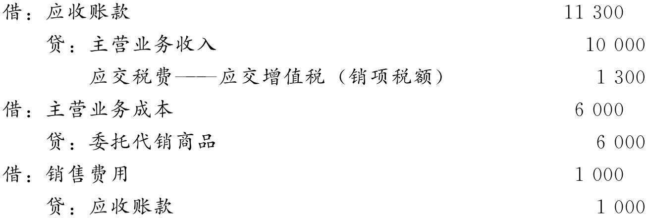 【例4-21】立兴商业公司委托A公司销售商品200件,商品已经发出,每件成本为60元。合同约定丙公司应按每件100元对外销售,立兴商业公司把售价的10%向A公司支付手续费。A公司对外实际销售100件,开出的增值税专用发票上注明的销售价款为10 000元,增值税额为1 300元,款项已经收到,立兴商业公司收到A公司开具的代销清单时,向A公司开具一张相同金额的增值税专用发票。假定立兴商业公司发出商品时纳税义务尚未发生,不考虑其他因素。
