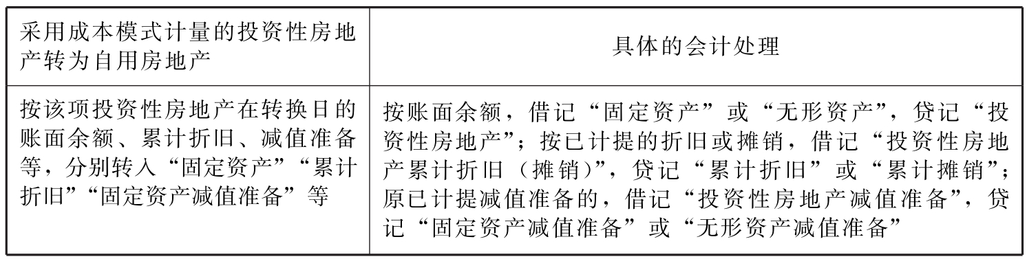表9-8 采用成本模式计量的投资性房地产转为自用房地产的会计处理