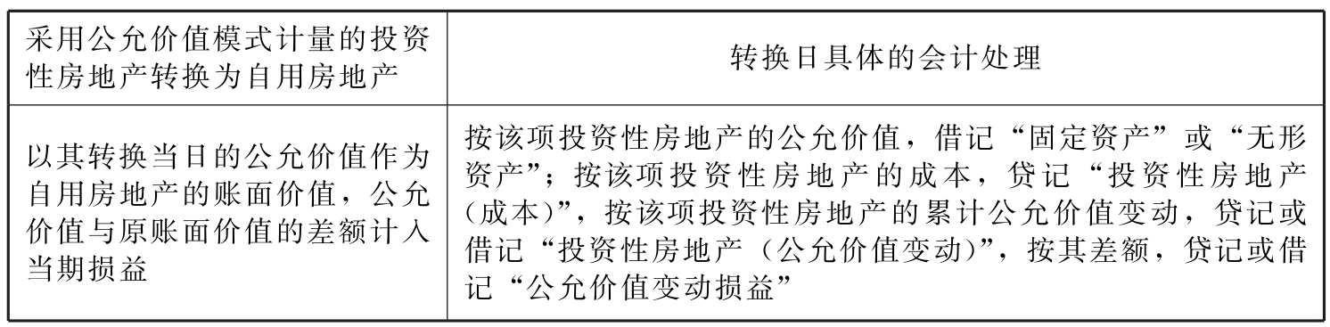 表9-10 采用公允价值模式计量的投资性房地产转为自用房地产的会计处理