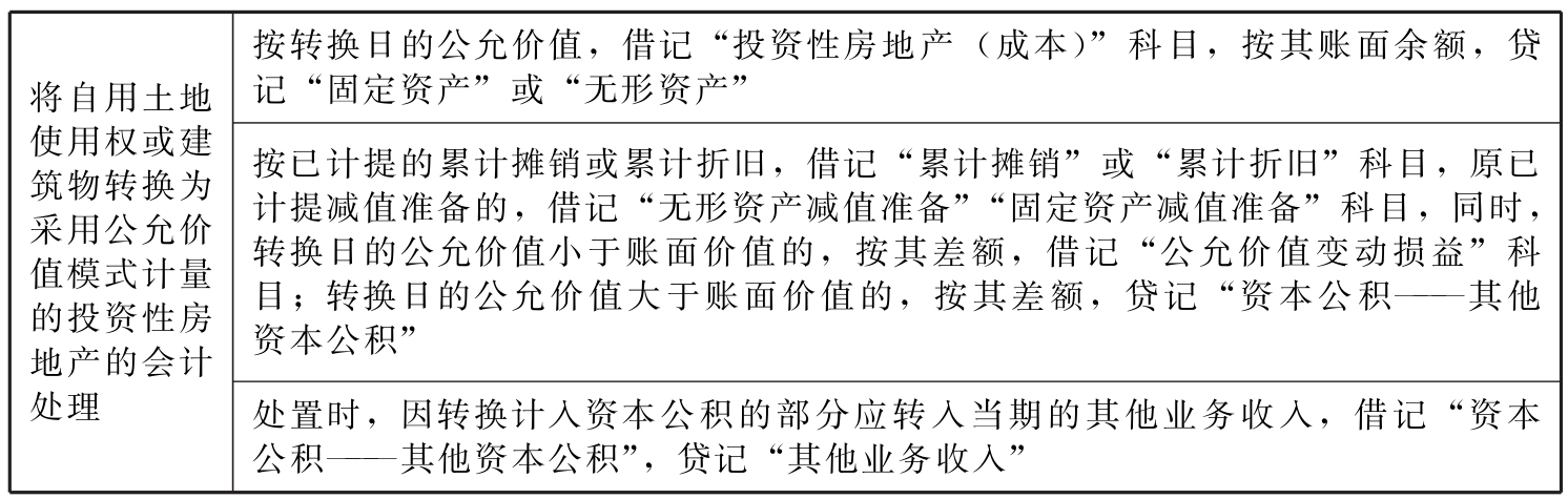 表9-12 自用土地使用权或建筑物转换为采用公允价值模式计量的投资性房地产的会计处理