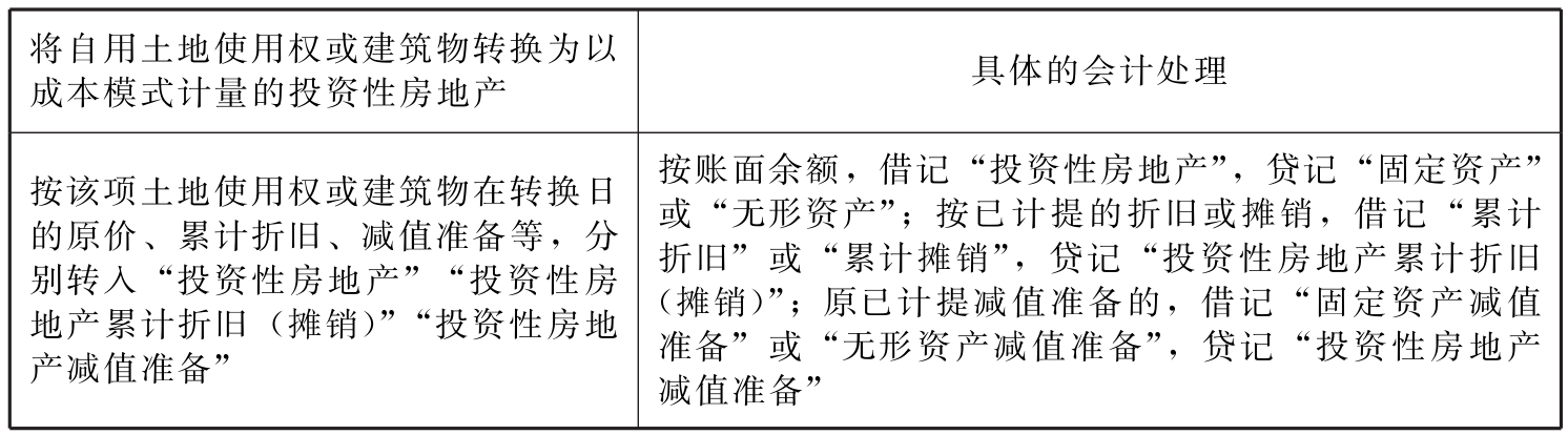 表9-9 自用土地使用权或建筑物转换为以成本模式计量的投资性房地产的会计处理