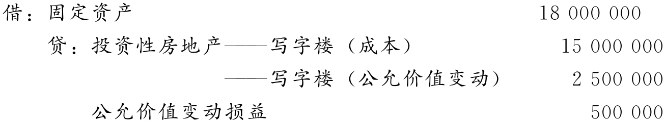 【例9-6】2018年10月15日,顺达商贸有限公司因租赁期满,将出租的写字楼收回,准备作为办公楼用于本企业的行政管理。该项房地产在转换前采用公允价值模式计量,原账面价值为17 500 000元,其中,成本为15 000 000元,公允价值变动为增值2 500 000元。