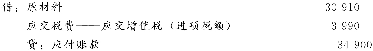 (3)购进原材料一批,原价30 000元,增值税3 900元,运费1 000元(供应单位代垫),共计34 900元,原材料已验收入库,货款未付。注意,由购货方实际承担的运费,可按9%作为进项税额抵扣。