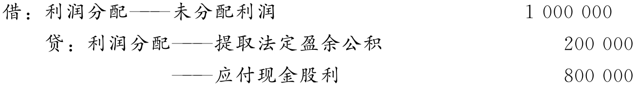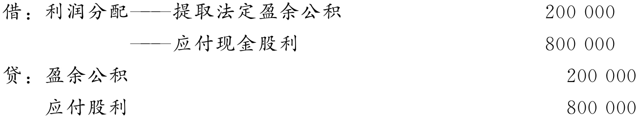 【例14-7】立兴股份有限公司年初未分配利润为0,本年实现净利润2 000 000元,本年提取法定盈余公积200 000元,宣告发放现金股利800 000元。假定不考虑其他因素,立兴股份有限公司的会计处理如下:
