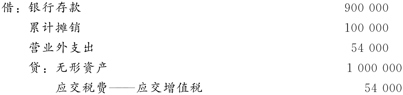 【例14-5】顺达商贸有限公司将拥有的一项非专利技术出售,取得价款900 000元,适用的增值税税率为6%,应交的增值税为54 000元。该非专利技术的账面余额为1 000 000元,累计摊销额为100 000元,未计提减值准备。会计分录如下: