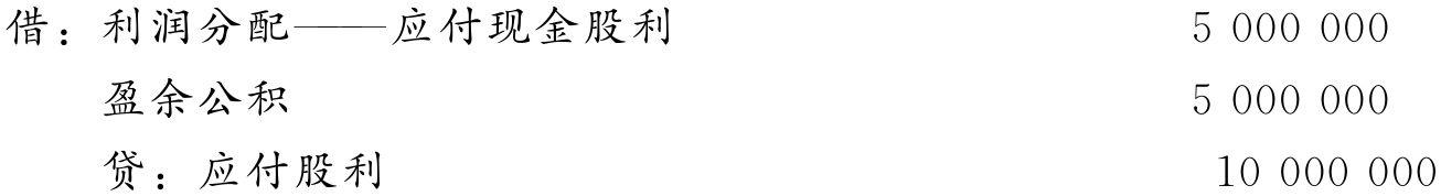 本例中,顺达商贸公司经股东大会批准,以未分配利润和盈余公积发放现金股利,属于以未分配利润发放现金股利的部分5 000 000元应计入“利润分配——应付现金股利”科目,属于以盈余公积发放现金股利的部分5 000 000元应计入“盈余公积”科目。