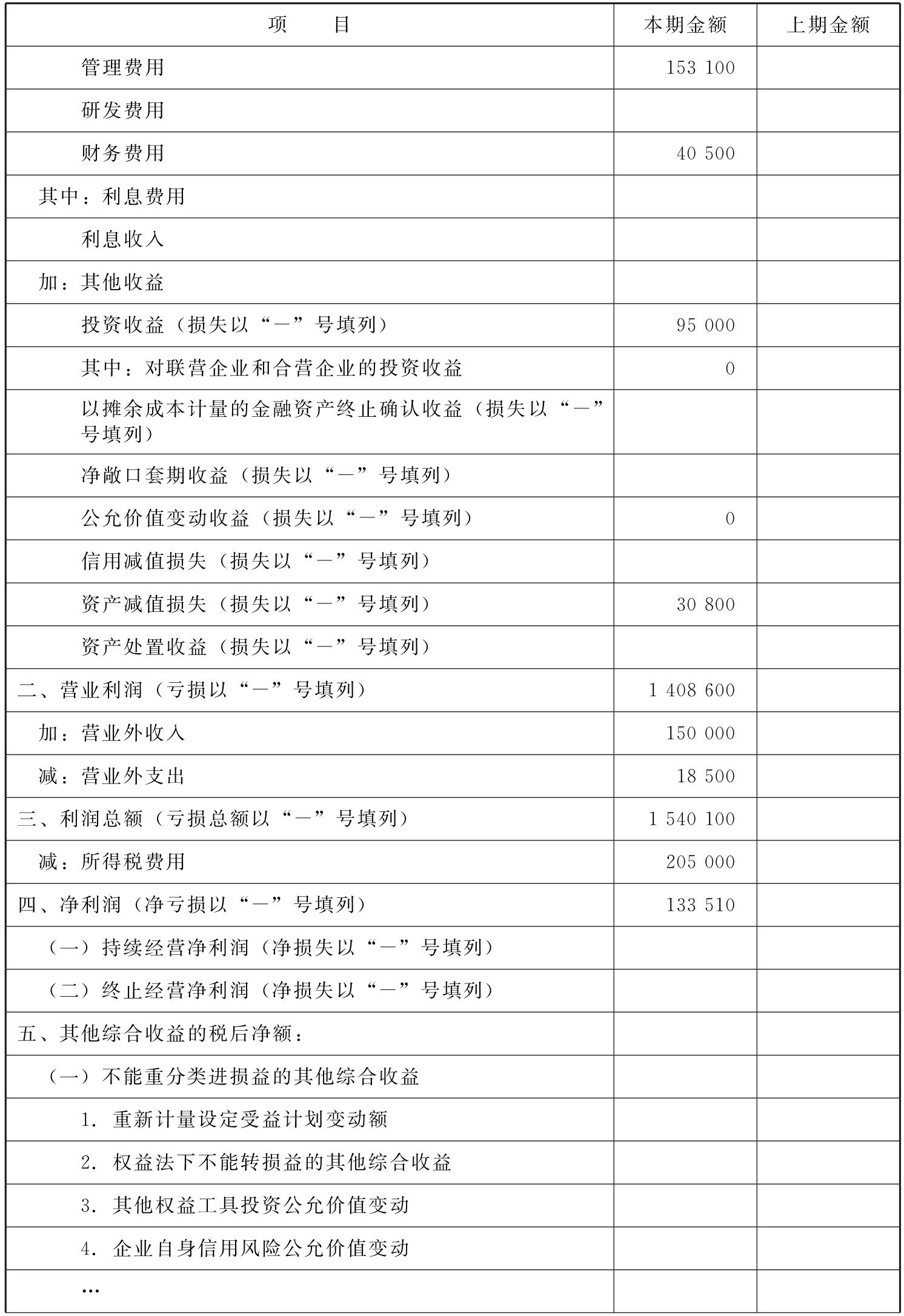 (1)管理费用的组成:职工薪酬80 000元,无形资产摊销30 000元,折旧费20 000元,支付其他费用23 100元。