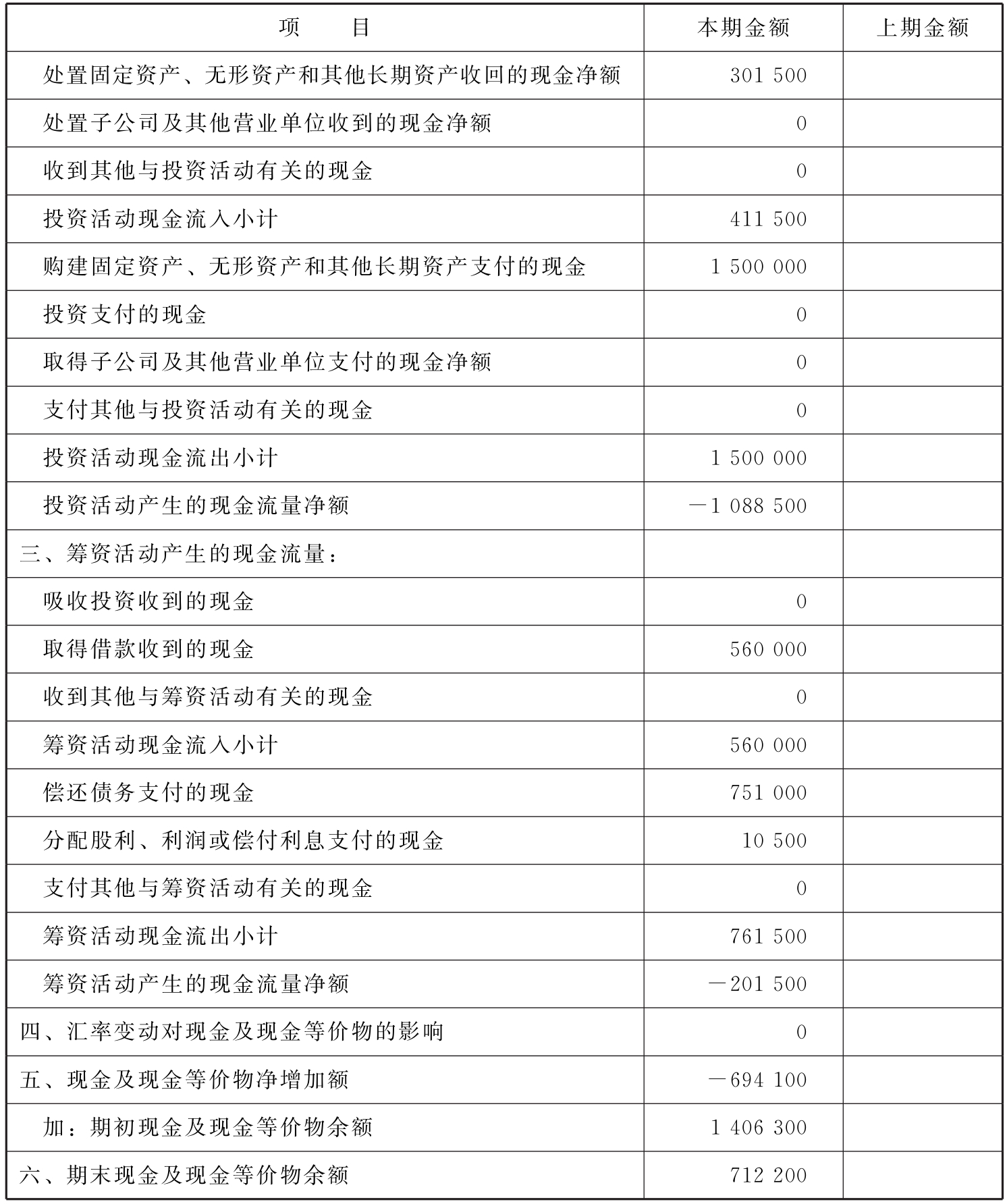(6)本期用现金购买固定资产1 200 000元,工程物资100 000元。