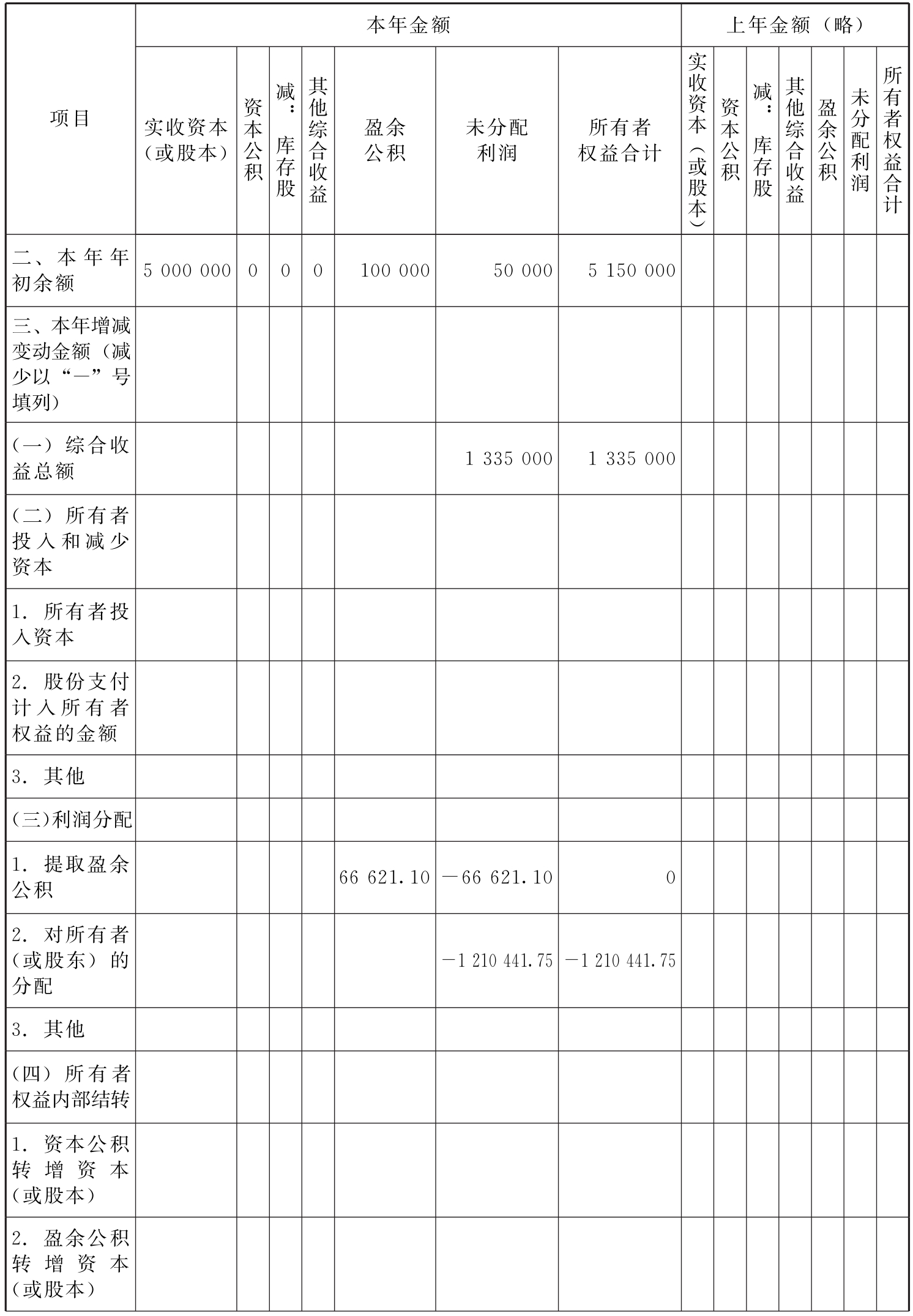 沿用【例15-1】【例15-2】和【例15-3】的资料,还有其他相关资料为:提取盈余公积66 621.10元,向投资者分配现金股利1 210 441.75元。