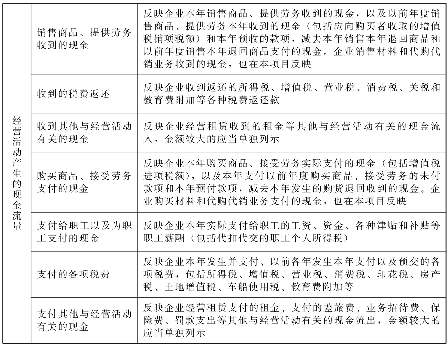 企业应当采用直接法列示经营活动产生的现金流量。直接法是指通过现金收入和现金支出的主要类别列示经营活动的现金流量。采用直接法编制经营活动的现金流量时,一般以利润表中的营业收入为起算点,调整与经营活动有关的项目的增减变动,然后计算出经营活动的现金流量。采用直接法具体编制现金流量表时,可以采用工作底稿法或T型账户法,也可以根据有关科目记录分析填列。