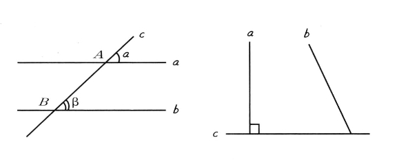 在左边的图形中,就是说直线a与直线b是永不相交,即平行的,而且∠α≠∠β。而右边的图形中,直线a和b永不会相交。