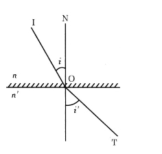 第三个定律是折射定律。光通过不同介质的界面时要产生折射,其入射线、折射线与法线在同一平面内。见图B。IO是入射线,OT则是折射线。