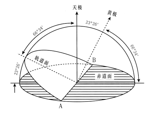 从图中我们看得出来,那个标着轨道面的就是黄道面,它外面那一圈就是黄道。标着赤道面的就是天球的赤道面了。在天球赤道面与黄道面之间有一个23°26′的夹角,而在天极与黄道面之间则有一个66°34′的夹角,它们合起来正好是90°。地球就是这么斜着身子绕太阳转的。这个23°26′的夹角被称为黄赤交角。这个角度也是地球一年四季的成因,这些我们后面还会细谈。