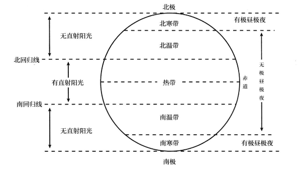 从这个图上我们可以知道五带是哪五个带以及它们各自在地球上的位置,这五个带其实可以合并为三个:即热带、温带与寒带。因为南、北温带与南、北寒带的气温特征差不多,只是季节相反罢了。