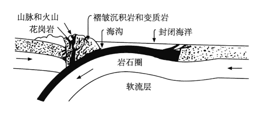 图中是一个大陆板块与一个海洋板块相撞的结果,可以看到,海洋板块向下滑入软流层,从而将大陆板块高高撬起,在那里形成山脉与火山,而在旁边的海底形成海沟。