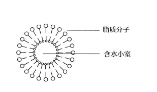 现在科学家们一般认为,一种“脂质体”可能是原始生物膜的模型。脂质体是一种人工制造的细胞样结构,由脂质分子双层包围着一个含水的小室构成。如下图: