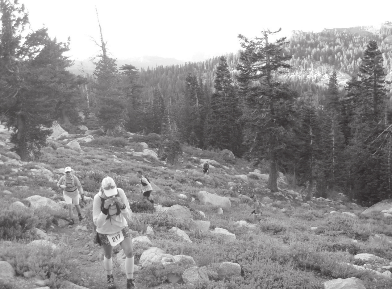从埃米格兰特山口出发,连接西部各州的小道穿过格兰尼特大荒野(Granite Chief Wilderness),该荒野是以一个突出的岩层命名的。这条路大部分沿着1855年建成的普莱塞县埃米格兰特路(Placer County Emigrant Road),一直到达罗宾逊弗拉特(Robinson Flat),即美国原住民聚会的地方,现在称为“塞拉十字”(Crossroads of the Sierra)。有好多条小道交汇在这里。然后,这条小路向西延伸,经过巴尼·卡瓦诺山脊(Barney Cavanaugh Ridge),它是以负责克朗代克(Klondike)金矿大淘金的矿工命名的。参赛者从那里进入淘金热地区的心脏地带,穿行于一系列的峡谷之中。今天很难体会到深谷(Deep Canyon)、戴德伍德峡谷(Deadwood Canyon)、埃尔多拉多峡谷和沃尔卡诺峡谷(Volcano Canyon)壮美的孤独与静寂,也很难体会到这一地区矿工淘金热时的景象。想当年,水流顺着木槽哗哗地流淌,叮叮当当修建棚户屋的声音,骡马的嘈杂声,矿工在烈日下干活时的咒骂声,会在峡谷岩壁上回荡数英里。