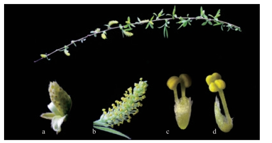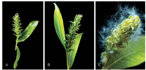 图2-2、图2-3 是垂柳的花和花序,以及果枝。垂柳的花分为雄花和雌花,其构造非常简单,没有丰富多彩的花萼、花瓣,仅花下有1 个苞片。雄花只有2 个雄蕊(图2-2c),雌花只有1 个雌蕊(图2-3A)。很多这样的花长在一起构成花序,柳树这样的花序叫做葇荑花序。