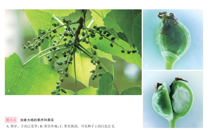 柳树是这样,杨树也是这样。虽然柳树的叶狭(披针形),杨树的叶宽(宽卵形),看上去不太一样,但是它们的性器官(花)的构造却是相似的。杨树的花同样是无被花,种子也具有白色的长毛,成熟后一样会飘散开来,也就是杨花。图2-4 是加拿大杨(Populus×canadensis)的果枝及果实近观,可见到受孕膨大的子房(即果实),子房剖开,种子上也附着着白色长毛。据此可以说杨、柳是“一家子”,都属于杨柳科。