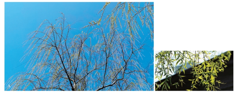 A.垂柳春天新萌发的枝叶;B.垂柳开花枝条近观