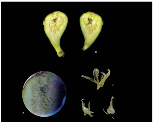 a. 刚长出来的小无花果(隐头花序)纵剖,里面有很多小花;b. 解剖镜下隐头花序局部放大;c. 花序上端的无性不育花,具4 个花被;d. 花序下端的雌花,可见子房、花柱和柱头