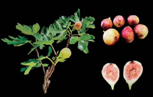 夏季到了,无花果成熟了,再来看看成熟的红色无花果发生了什么变化。图2-9 中无花果雌株上,果实已明显变大;将成熟无花果纵向剖开,发现原来的小花已经不见了,取而代之的是白色的小果。