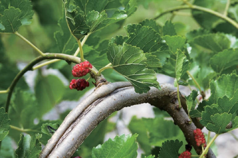 桑科的植物有很多种,桑葚是桑科中我们熟知的另一种水果,它是桑树(Morus alba)的果实(图2-10)。桑树的花也是“简约之花”,只有花萼,单性,许多这样的花再组成葇荑花序;桑葚是由整个花序发育形成的果实。像桑葚和无花果这样的由整个花序发育而成的果实,我们称为聚花果。