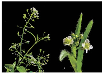 荠菜也是十字花科植物,上海地区早春二月即可见其开花、结果。它的花、果均小,仅数毫米,但十字形花冠明显,雄蕊亦4 长2 短;果呈三角形,剖开可见与油菜果实相似的构造(图3-13、图3-14)。
