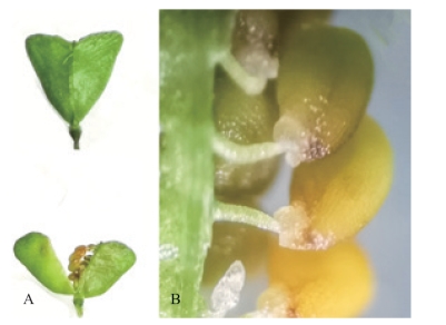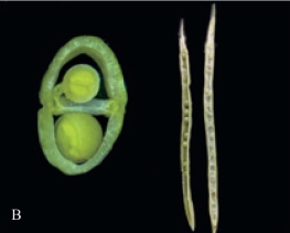 A. 短角果外观及剖开;B. 果实内部放大,示胚珠着生