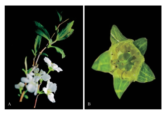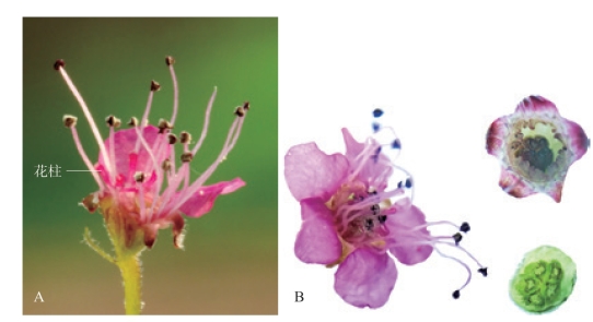 A. 花、叶外观;B. 去掉花瓣、雄蕊后的萼筒顶面观