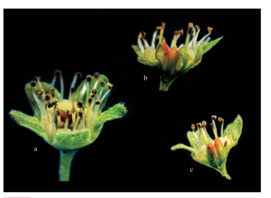 a. 花去花瓣;b. 萼筒及子房纵剖;c. 经萼筒中央纵剖