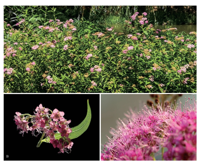 A. 绿地中的粉花绣线菊;B. 粉花绣线菊的花、叶特写;C. 粉色绣线菊花近景