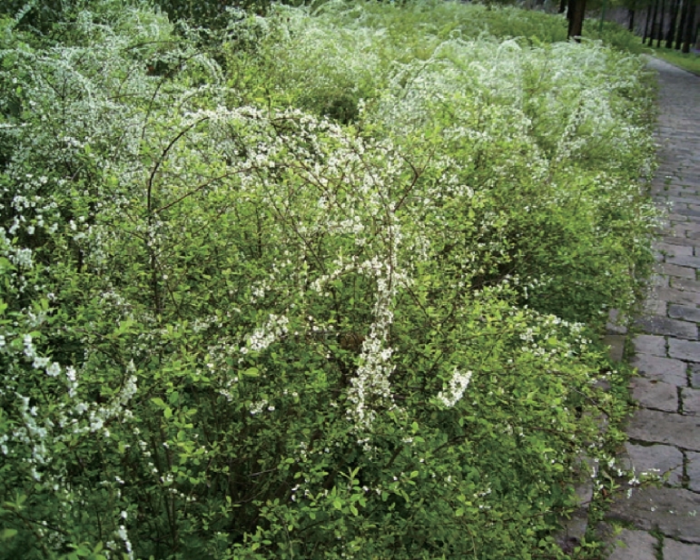 图4-21 是另一种绣线菊,花小而密,开花时缀满枝条,好似雪花点点,因而得一形象的名字:喷雪花。《中国植物志》上的正名为“珍珠绣线菊”,意指它的花小而洁白如珍珠。它的学名是Spiraea thunbergii,前一个词是属名,绣线菊属;后一个词是种加词,这是一个瑞典植物学家的姓,为纪念他而用作好多植物的种加词。