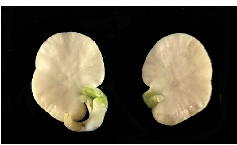 a. 胚芽;b. 胚轴;c. 胚根;d,e. 子叶